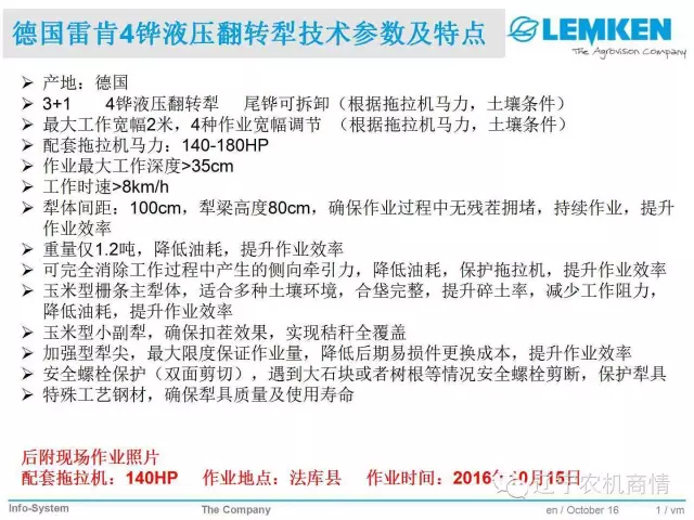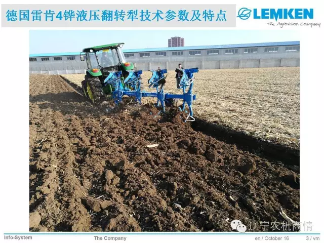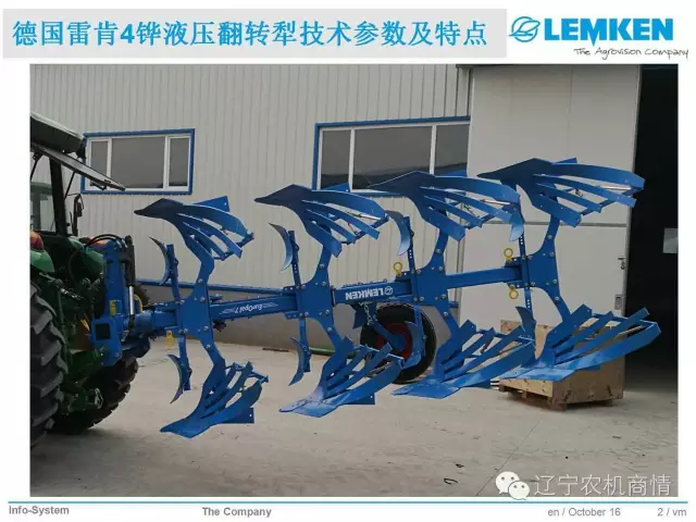 雷肯农业机械(青岛)有限公司1780年创建。作为世界著名的耕整地机具,播种机和植保机械的生产商,公司目前有710名雇员,在德国拥有三个工厂。公司位于下莱因区的一个风景秀丽的小镇阿尔蓬市,距离杜塞尔多夫市西北方大约50公里。德国LEMKEN公司每年的年产量达到10000台各种农机具,2007年公司的营业额达到1.8亿欧元。德国LEMKEN的农机具60%以上出口到世界50多个国家。在德国LEMKEN的翻转犁和联合整地机占据35%的市场份额,位居同行第一。